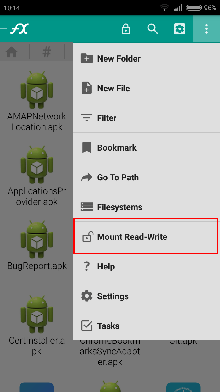 - A questo punto, si aprirà una nuova finestra con all’interno tutte le applicazioni di sistema, non rimane fare altro che andare sul menù in alto a destra dove ci sono i 3 puntini, selezionare Mount Read-Write , mettere lo spunta e dare l’OK