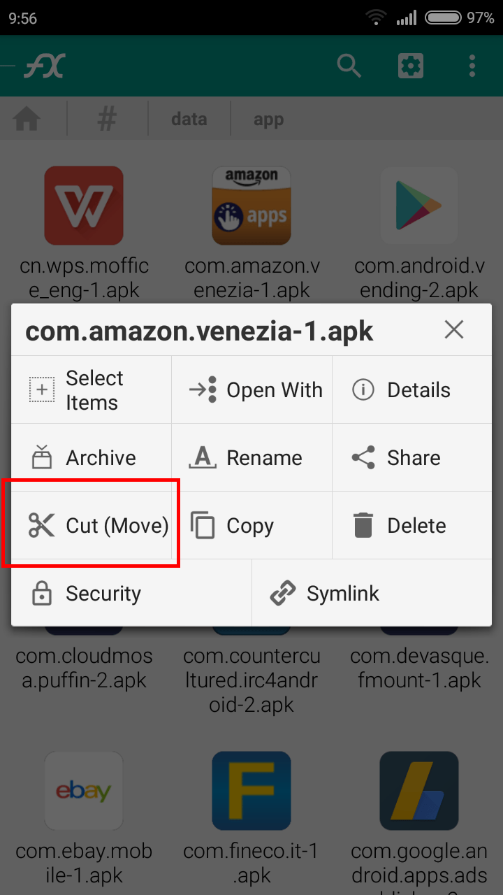 - Adesso premere a lungo con il dito sull’applicazione che si vuole trasferire (quindi come da esempio l’Amazon Shop) e si aprirà ora una nuova finestra, dove si dovrà premere sull’icona con le forbici Cut (Move)