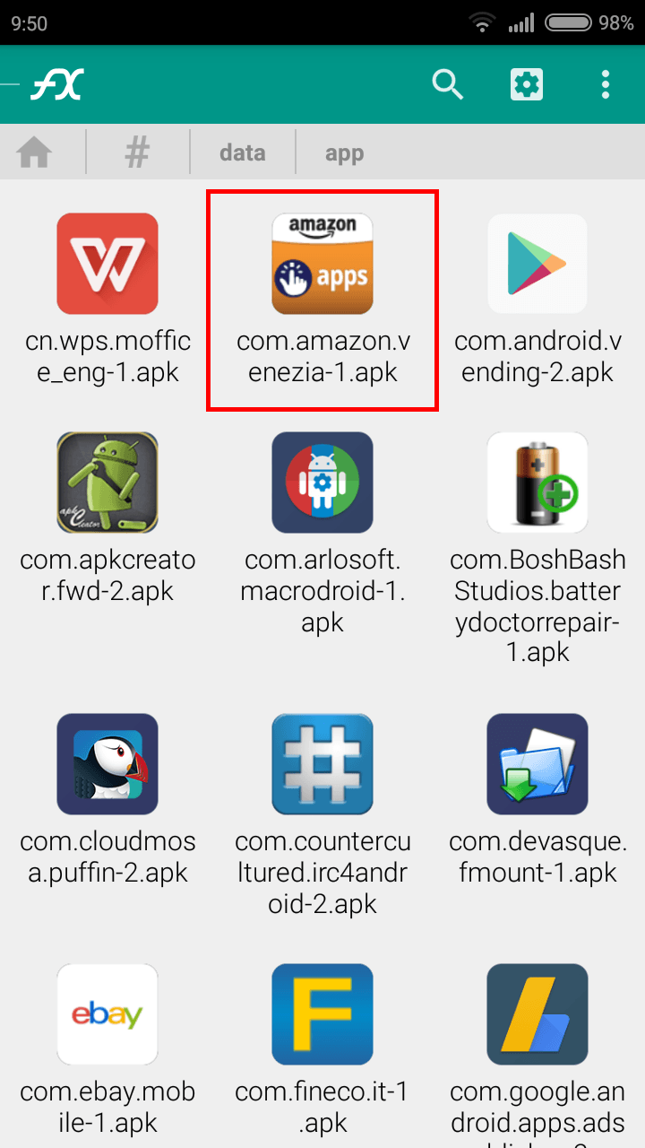- Una volta dentro, si deve entrare nella cartella data e poi nella schermata successiva su app, verrà aperta una nuova finestra con tutte le applicazioni da noi installate da cui andrà selezionata l’app da far diventare di sistema, ad esempio l’app shop Amazon